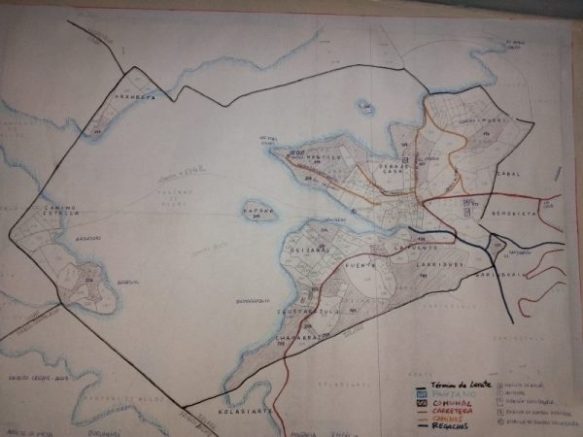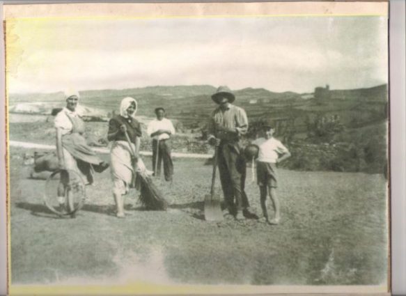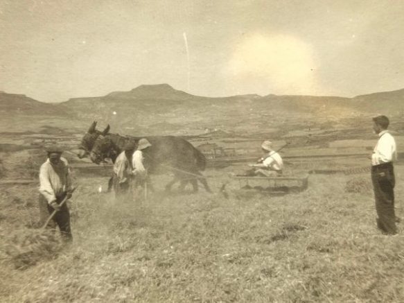 Como sólo se dejaba de trabajar los domingos y los días de fiesta, la gente se pasaba la mayor parte de tiempo en el campo. Se iba todos los días a no ser que el tiempo fuera extraordinariamente malo. La estampa o imagen del campo que veríamos era de muchas más parcelas de las que vemos hoy, de tamaño más pequeño y con gente y animales trabajando en ellas. Se escuchaban conversaciones entre unas familias y otras. Se hablaban y ayudaban unos a otros; también se cantaba. Y como es lógico también había más conflictos personales y de mugas[2] entre parcelas.