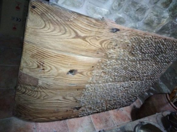 [7]Trillo. Básicamente era una tabla tirada por una caballería, que por debajo tenía pequeñas piedras cortantes los más antiguos, o hierros dentados o ruedas los más modernos, y servía para trocear lo más posible la mies a base de dar muchas vueltas en la era.