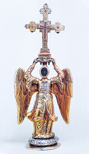 La imagen que porta las reliquias representa un ángel alado con una cruz alzada, toda ella cubierta de plata dorada, es una imagen de plata con alma de madera.